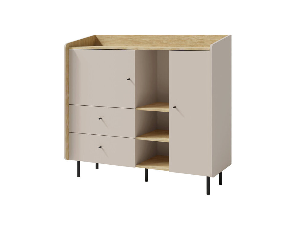 Prosta, nowoczesna bryła oraz matowe wykończenie sprawiają, że nowoczesna komoda z szufladami pasuje do wielu stylów wnętrz – od nowoczesnych i minimalistycznych, po spokojne aranżacje w stylu japandi czy soft loft. Kolor beż piaskowy ociepla wnętrze i dobrze komponuje się z drewnem, czernią, jasnymi tkaninami i naturalnymi dodatkami.