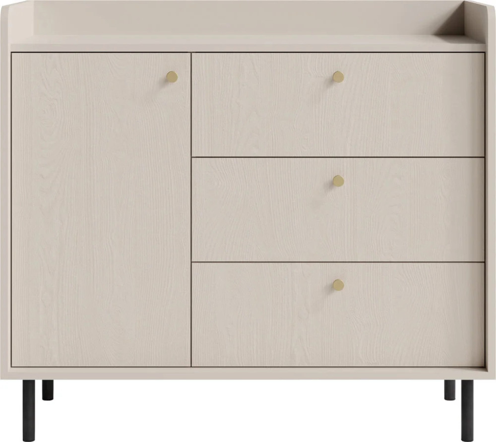 Mała komoda GRANDE 103.5 cm w kolorze beż piaskowy to funkcjonalna komoda do salonu, sypialni lub przedpokoju, która zapewnia wygodne miejsce do przechowywania różnych przedmiotów. Kompaktowa szerokość 103.5 cm sprawia, że komoda sprawdzi się również w mniejszych pomieszczeniach.