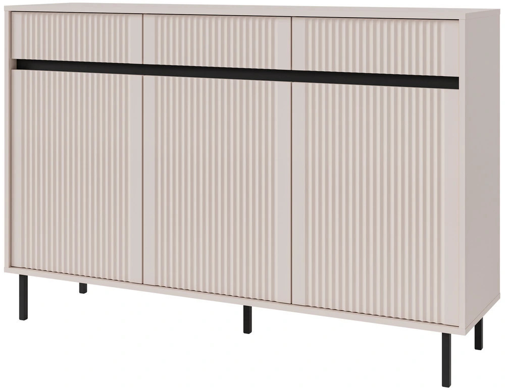 Pojemna komoda z szufladami OSAKA 149 cm w kolorze beż piaskowy to nowoczesny mebel do salonu, który łączy dużą przestrzeń do przechowywania z lekką i elegancką formą. Szerokość 149 cm sprawia, że pojemna komoda z szufladami dobrze prezentuje się w strefie dziennej, jednocześnie oferując wygodne miejsce na uporządkowanie wielu domowych przedmiotów.