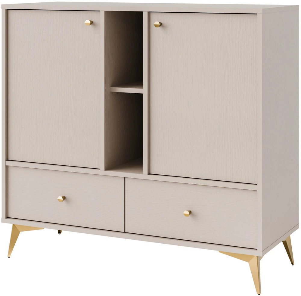 Wykończenie w kolorze beż piaskowy nadaje bryle lekkości i nowoczesnego charakteru. Ta dwudrzwiowa komoda z szufladami dobrze komponuje się z jasnymi wnętrzami i naturalnymi materiałami.
