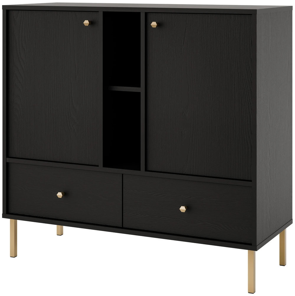 Wykończenie w kolorze czarny grafit nadaje bryle elegancki i nowoczesny charakter. Ta dwudrzwiowa komoda z szufladami dobrze wpisuje się w aranżacje loftowe, minimalistyczne i nowoczesne.