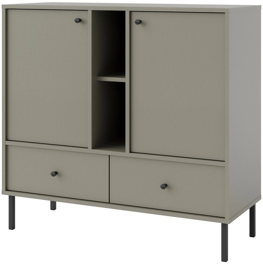 Wykończenie w kolorze eukaliptus nadaje wnętrzu naturalny i spokojny charakter. Ta dwudrzwiowa komoda dobrze komponuje się z drewnem, jasnymi dodatkami oraz aranżacjami inspirowanymi stylem japandi i nowoczesnym minimalizmem.