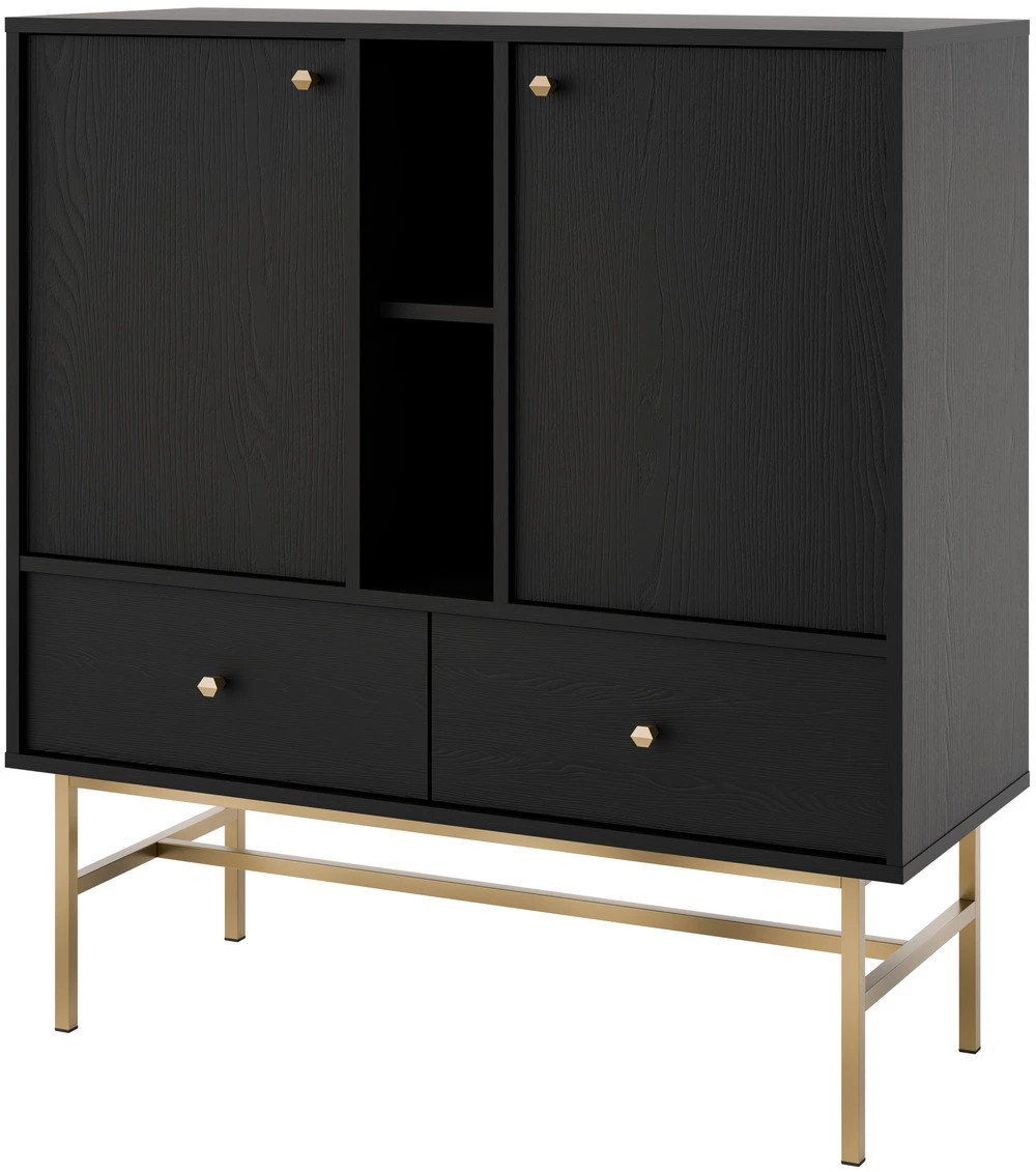 Wykończenie w kolorze czarny grafit nadaje bryle wyrazistego i eleganckiego charakteru. Ta dwudrzwiowa komoda z szufladami dobrze komponuje się z drewnem, metalem oraz jasnymi dodatkami, tworząc spójną aranżację wnętrza.
