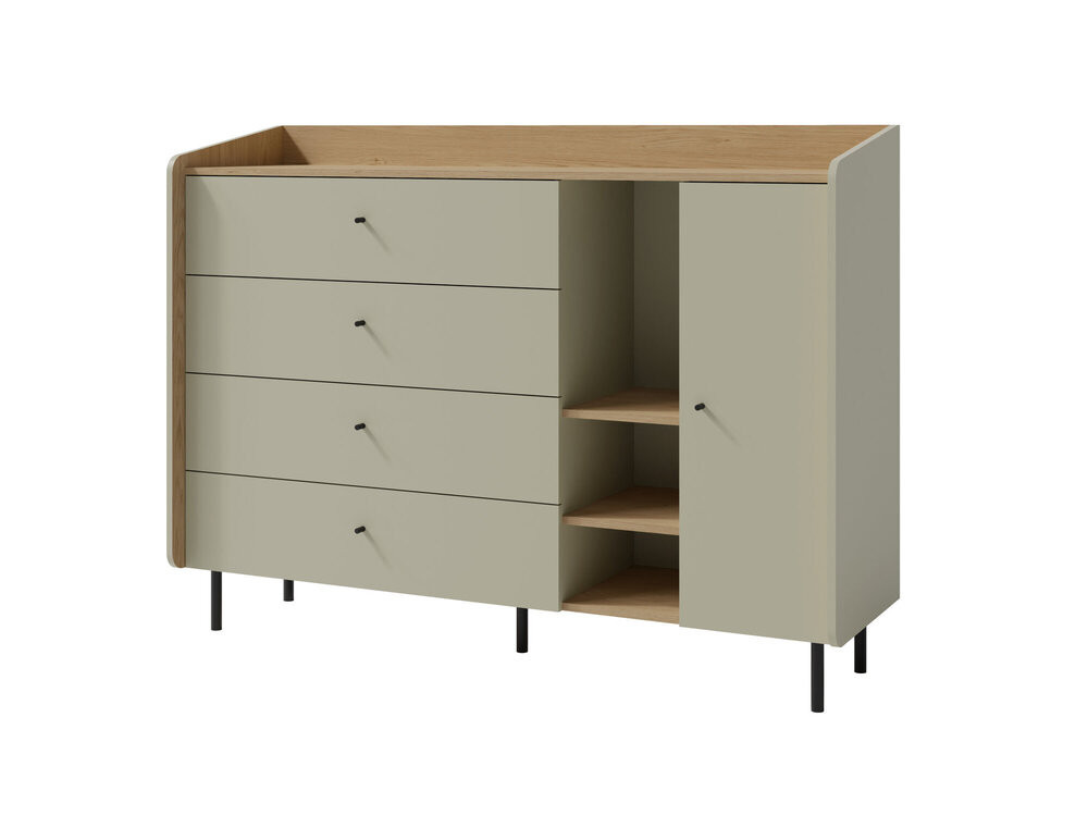 Nowoczesna forma, prosta bryła oraz matowe wykończenie sprawiają, że duża komoda z szufladami dobrze pasuje do nowoczesnych i minimalistycznych wnętrz. Kolor eukaliptus wprowadza do wnętrza spokojny, naturalny charakter, a jednocześnie pozwala łatwo dopasować komodę do innych mebli i dodatków.
