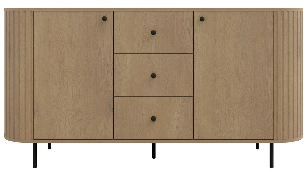 To funkcjonalna komoda do salonu z trzema szufladami i dwiema szafkami, która zapewnia wygodne przechowywanie odzieży, tekstyliów, dokumentów lub akcesoriów domowych. Przemyślany układ wnętrza sprawia, że komoda do salonu OVALIO 165 cm łączy estetykę z codzienną praktycznością.