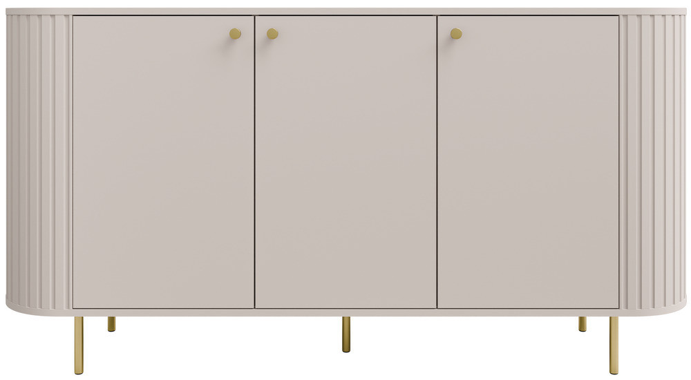 Pojemna komoda trzydrzwiowa OVALIO 165 cm w kolorze beż piaskowy to funkcjonalny i elegancki mebel zaprojektowany z myślą o nowoczesnych aranżacjach. Ta pojemna komoda trzydrzwiowa o szerokości 165 cm oferuje dużą przestrzeń do przechowywania, jednocześnie zachowując lekką i harmonijną formę.