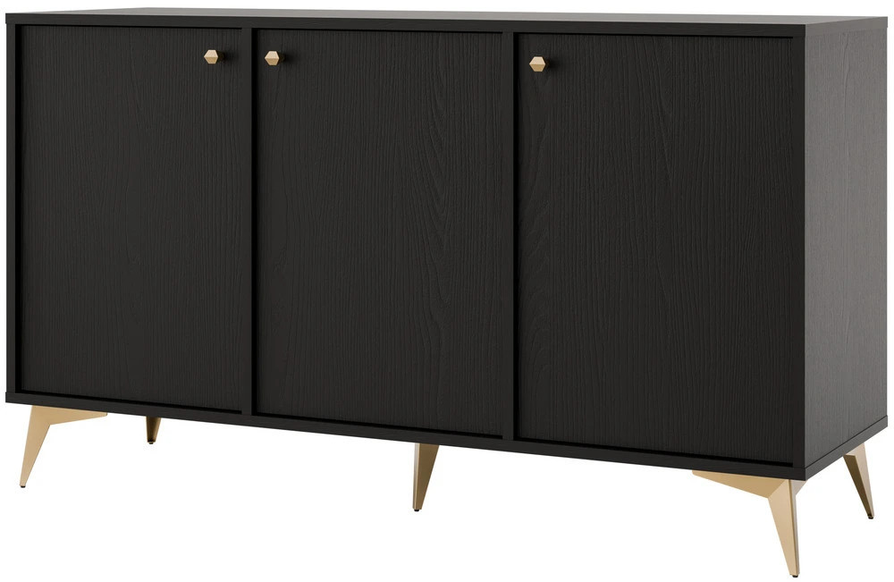 Dzięki szerokości 125 cm mebel oferuje wygodną przestrzeń użytkową, a trzydrzwiowa konstrukcja pozwala na efektywne przechowywanie przedmiotów codziennego użytku. Wewnętrzne półki umożliwiają organizację zastawy, dokumentów lub tekstyliów, dlatego komoda do salonu pomaga utrzymać porządek i funkcjonalność przestrzeni.
