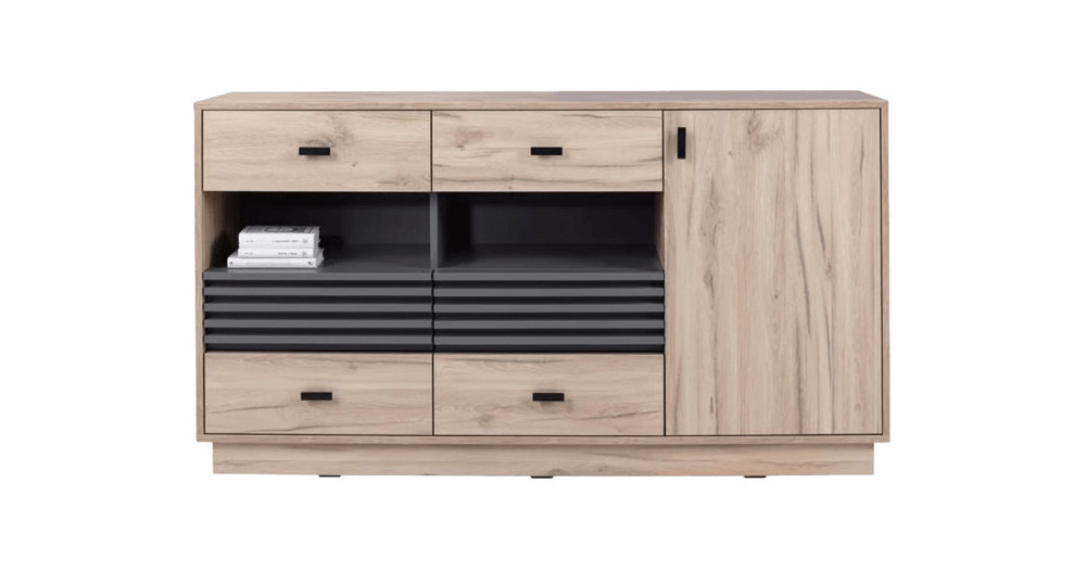 Korpus komody ALLMO 155 cm wykonano z trwałej płyty meblowej w dekorze dąb estana. Komoda może być ustawiona samodzielnie lub jako element większego zestawu mebli z kolekcji ALLMO.