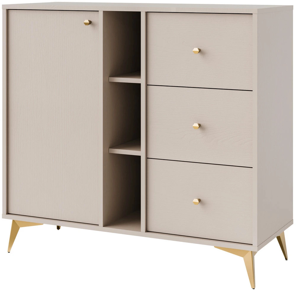 Mała komoda z szufladami TOKYO 100 cm w kolorze beż piaskowy to funkcjonalny i elegancki mebel, który świetnie sprawdza się w salonie, przedpokoju lub sypialni. Ta mała komoda z szufladami łączy nowoczesny styl z wygodnym miejscem do przechowywania, dlatego dobrze pasuje do uporządkowanych i estetycznych wnętrz.
