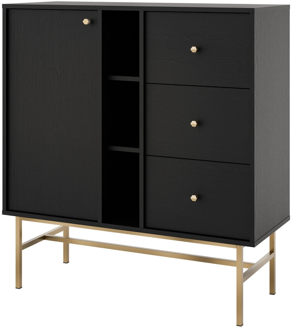 Model osadzono na metalowym stelażu, który podkreśla nowoczesny design i zapewnia stabilność konstrukcji. Dzięki temu mała komoda TOKYO prezentuje się lekko i stylowo.