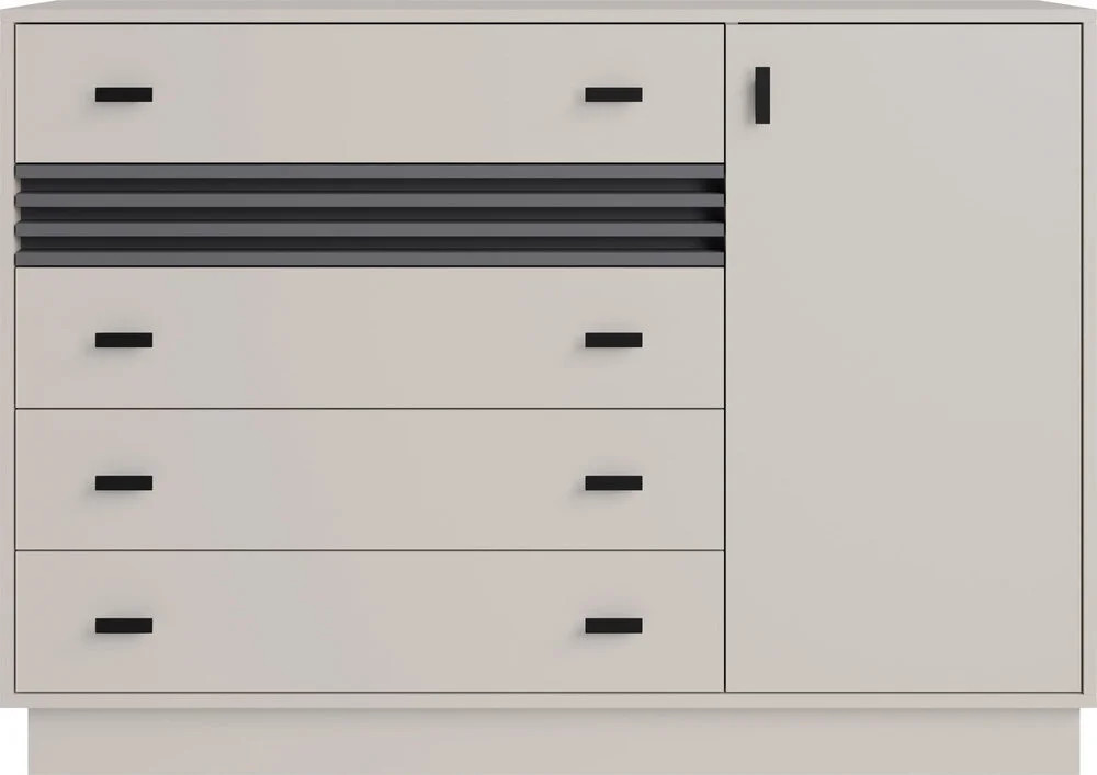 Fronty komody ozdobione zostały poziomymi lamelami, które nadają bryle charakteru i podkreślają nowoczesny styl mebla. Kolor kaszmir dodaje całości lekkości i elegancji, a matowe wykończenie sprawia, że komoda dobrze komponuje się z pozostałymi meblami z kolekcji ALLMO.