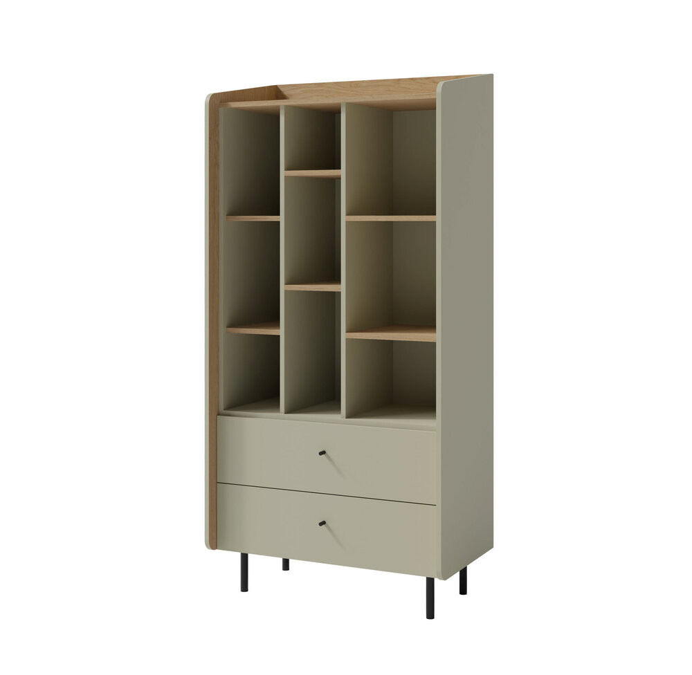 Regał z szufladami i półkami wyróżnia się prostą, dopracowaną bryłą oraz stonowaną kolorystyką. Odcień eukaliptus w połączeniu z matowym wykończeniem nadaje meblowi naturalnej lekkości i sprawia, że łatwo dopasować go do innych elementów wyposażenia. Mebel dobrze wygląda zarówno jako samodzielny regał, jak i część większego zestawu mebli z kolekcji ALESSIO.