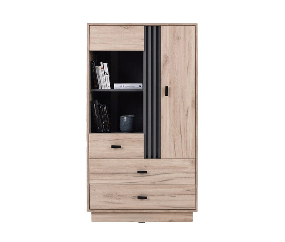 To regał z półkami i szufladami, który pozwala uporządkować przestrzeń i jednocześnie wyeksponować dekoracje lub książki. Szuflady umożliwiają przechowywanie drobnych przedmiotów, a półki pomagają zachować porządek.