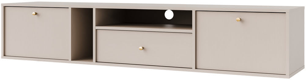 Nowoczesna wisząca szafka RTV TOKYO 180 cm w kolorze beż piaskowy to elegancki mebel zaprojektowany z myślą o estetycznej i funkcjonalnej strefie telewizyjnej. Ta nowoczesna wisząca szafka RTV doskonale sprawdza się w salonie, łącząc minimalistyczny wygląd z praktycznym układem przechowywania.