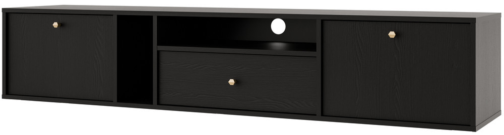 Dzięki szerokości 180 cm mebel zapewnia wygodne miejsce na telewizor oraz sprzęt multimedialny. Podwieszana konstrukcja sprawia, że nowoczesna wisząca szafka RTV optycznie odciąża wnętrze i pozwala stworzyć nowoczesną strefę telewizyjną w salonie.
