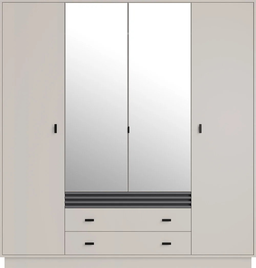 Dzięki dużej pojemności, lustrzanym frontom i praktycznym szufladom czterodrzwiowa szafa do sypialni ALLMO 200 cm kaszmir to wygodne rozwiązanie dla osób, które potrzebują dobrze zorganizowanej przestrzeni do przechowywania i chcą zachować nowoczesny wygląd wnętrza.