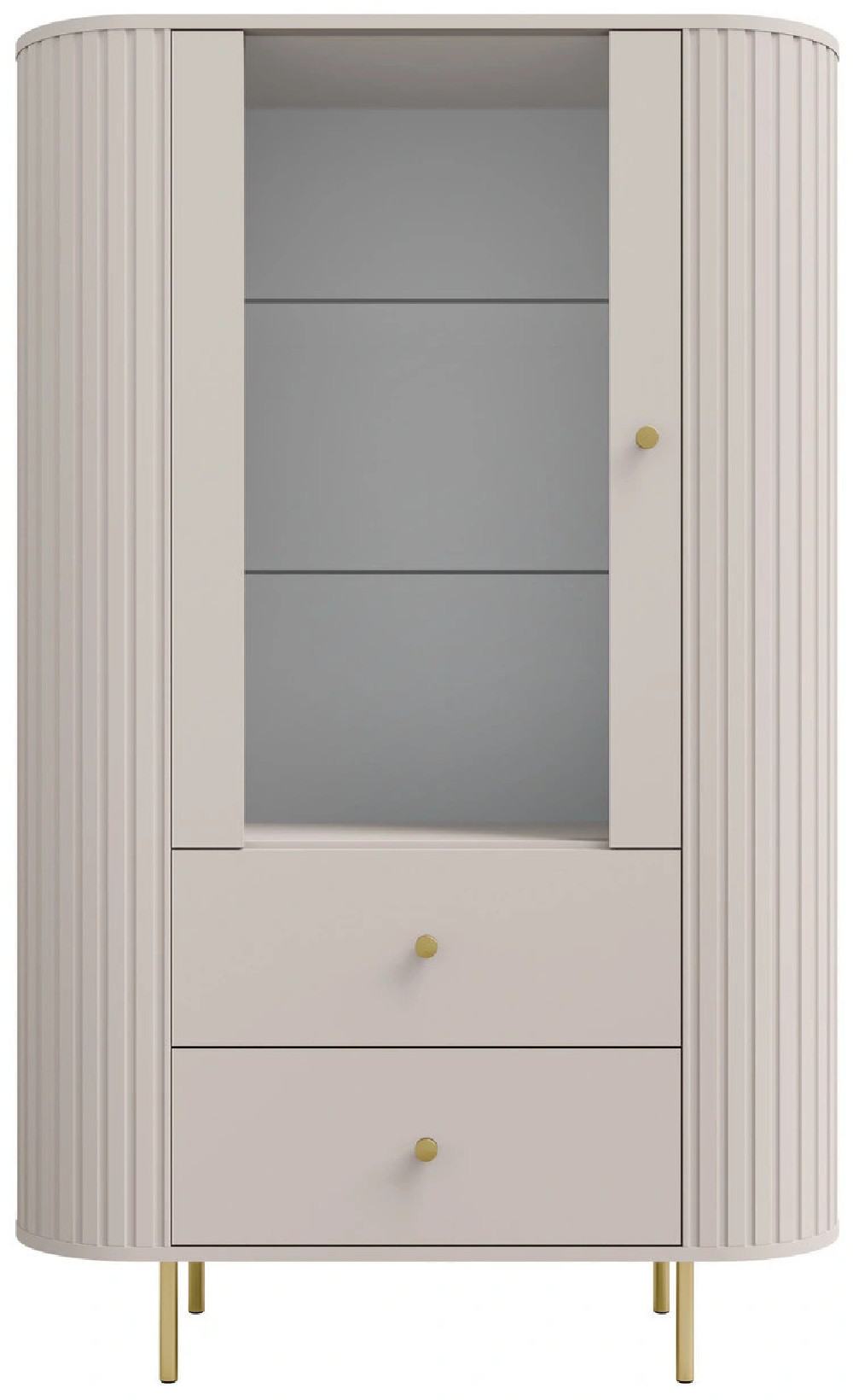 Dzięki dopracowanej formie i stonowanej kolorystyce witryna OVALIO beż piaskowy doskonale komponuje się z pozostałymi meblami kolekcji. To idealny wybór dla osób, które szukają ryflowanej witryny z przeszkleniem, a także mebla takiego jak nowoczesna witryna Ovalio, łączącego estetykę, pojemność i ponadczasowy design.